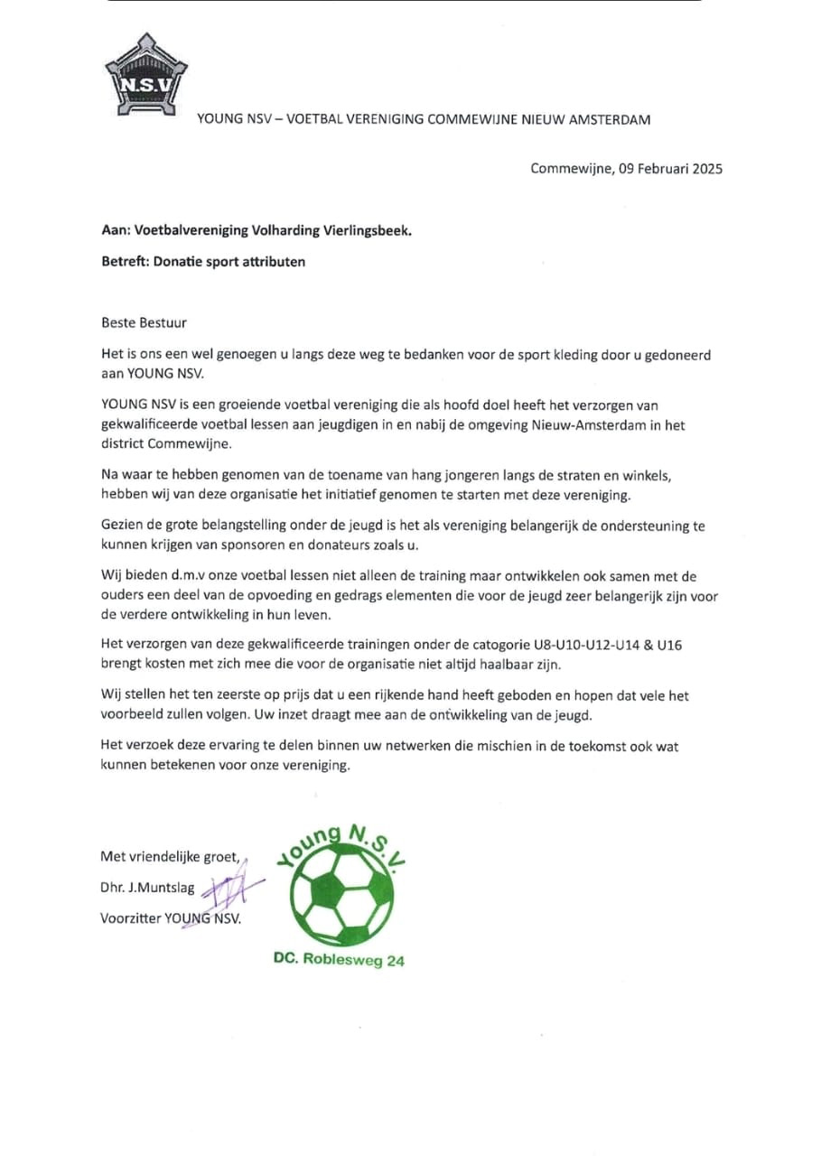 COMMEWIJNE - Afgelopen jaar heeft Volharding, onder aanvoering van Antwan en Arno, een compleet Volharding-tenue kunnen doneren aan een groep enthousiaste jongeren in Suriname. Dankzij hun inzet voetbalt het team Young NSV uit Commewijne nu als een echt team in onze rood-witte kleuren!